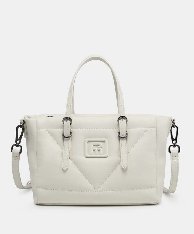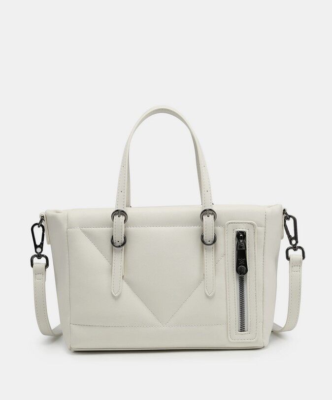 El bolso de mano 261150 es ese modelo estructurado que eleva cualquier look con un toque moderno y definido. Su diseño geométrico con panel frontal en forma de V y las dos tiras decorativas con aros metálicos aportan carácter y personalidad. El bolsillo vertical exterior con cremallera añade un detalle diferente y práctico que marca la diferencia a simple vista.