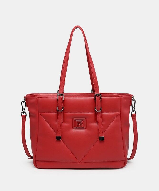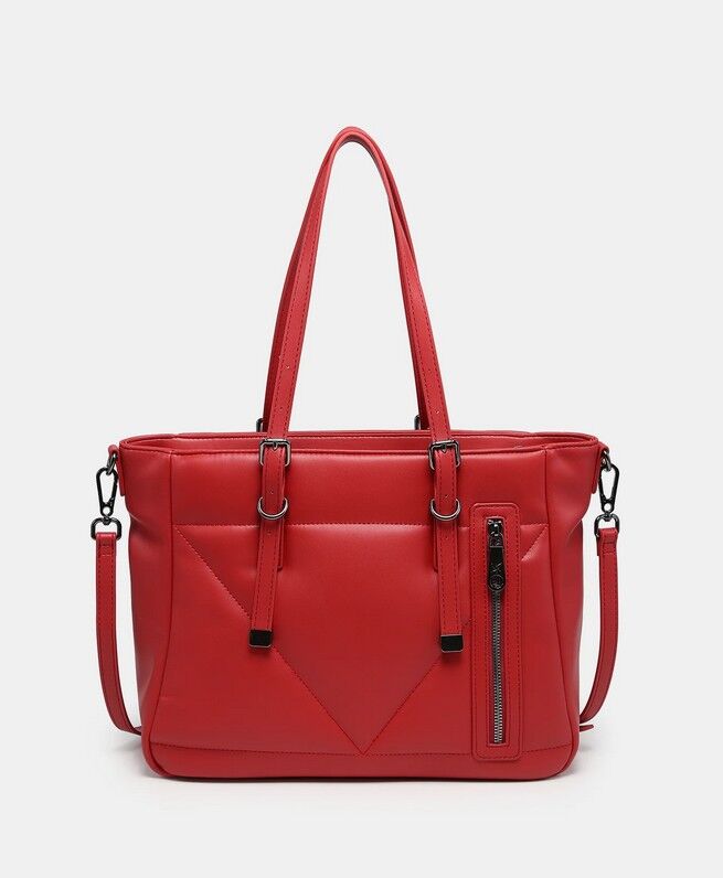 El bolso de hombro 261154 combina amplitud y diseño en un formato cómodo y muy versátil. Su frontal con panel geométrico en forma de V y las tiras decorativas con aros metálicos le aportan carácter y un toque moderno que eleva cualquier look. Es ese bolso práctico que te acompaña durante todo el día sin perder estilo.
