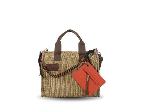 Bandolera Devota & Lomba Muse en color marrón, ligera y funcional, con diseño en paja y nylon, cierre de cremallera y correa ajustable ideal para uso diario.