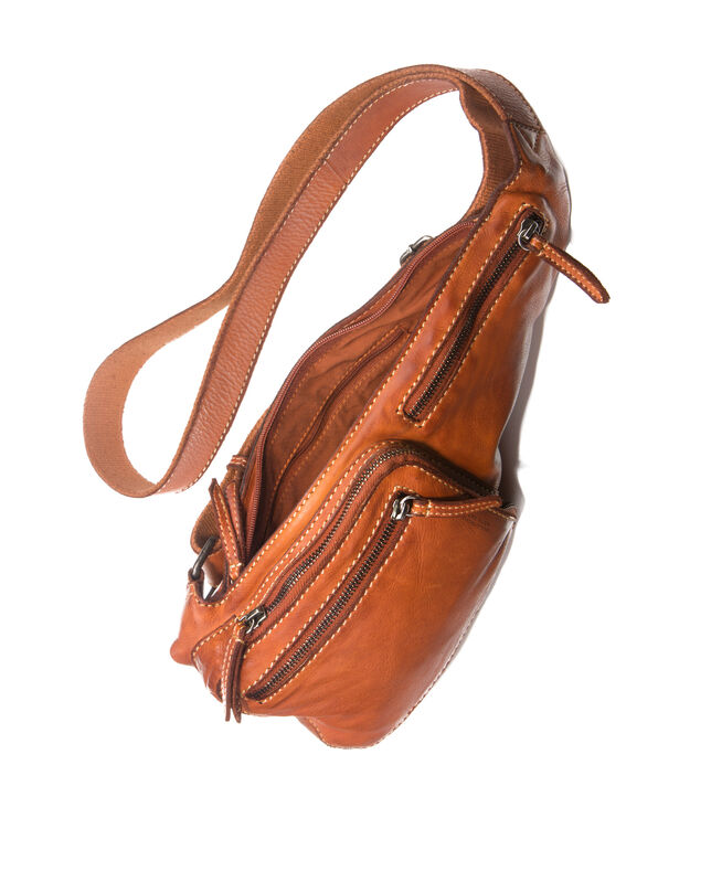 Mochila en piel lavada de primera calidad con bandolera regulable, para llevar cruzada. En la parte delantera dispone de un bolsillo grande y otro pequeño en la parte superior. Al compartimento principal se accede gracias a una cremallera. Otra cremallera da acceso a un bolsillo en la parte posterior. Costuras en contraste. Herrajes metálicos en zamak. Forro de algodón. Colección Tichi.